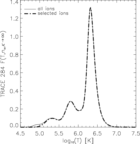 From all presently available EUV imaging instruments, i.e., SOHO/EIT (Delaboudinière et al. 1996), TRACE (Handy et al. 1999), and STEREO/EUVI (Wuelser et al. 2004), we chose TRACE to demonstrate the influence of the -distributions on the filter responses to emission. This selection is based on TRACE having the highest spatial resolution. The spectral responses