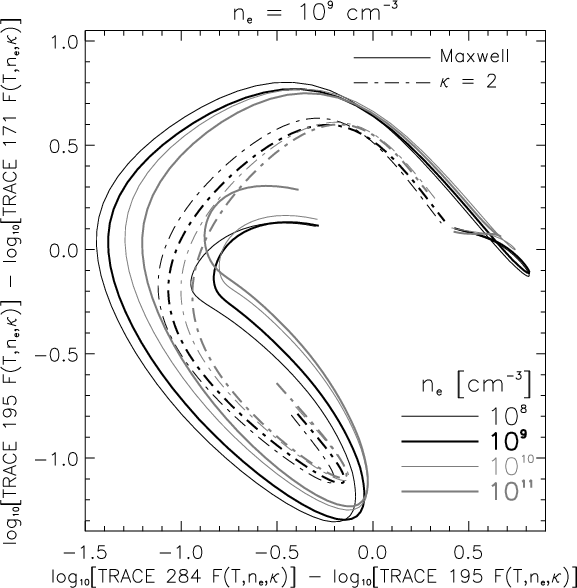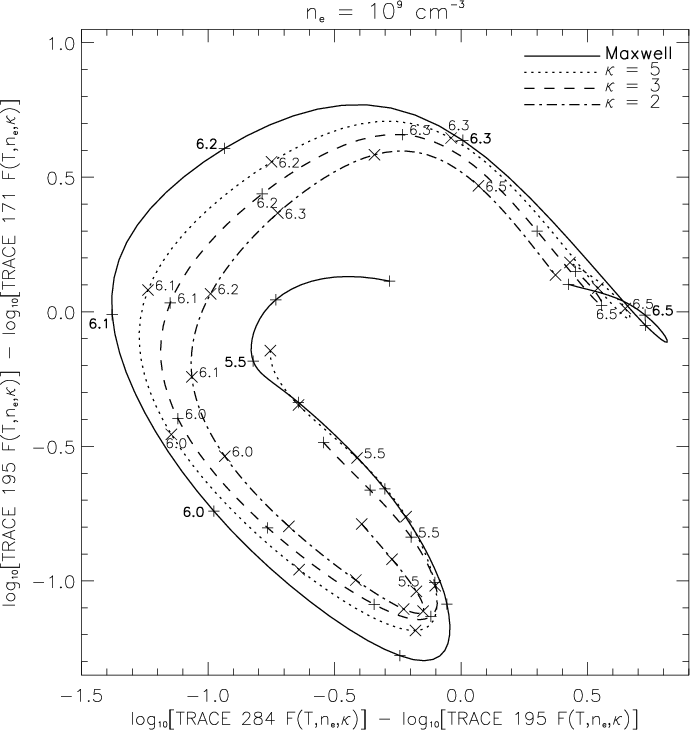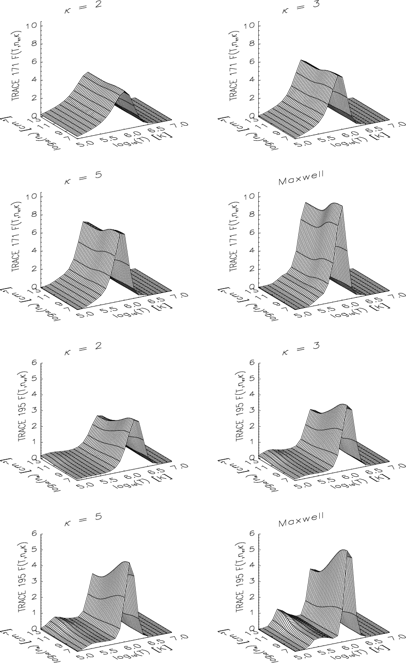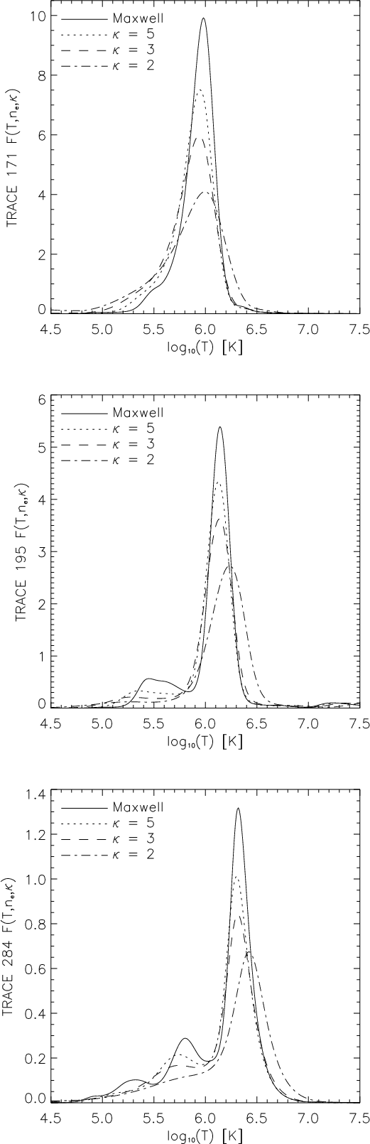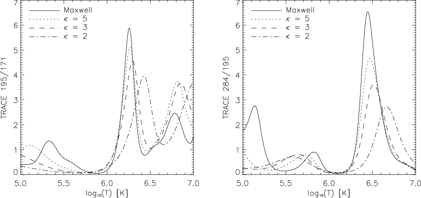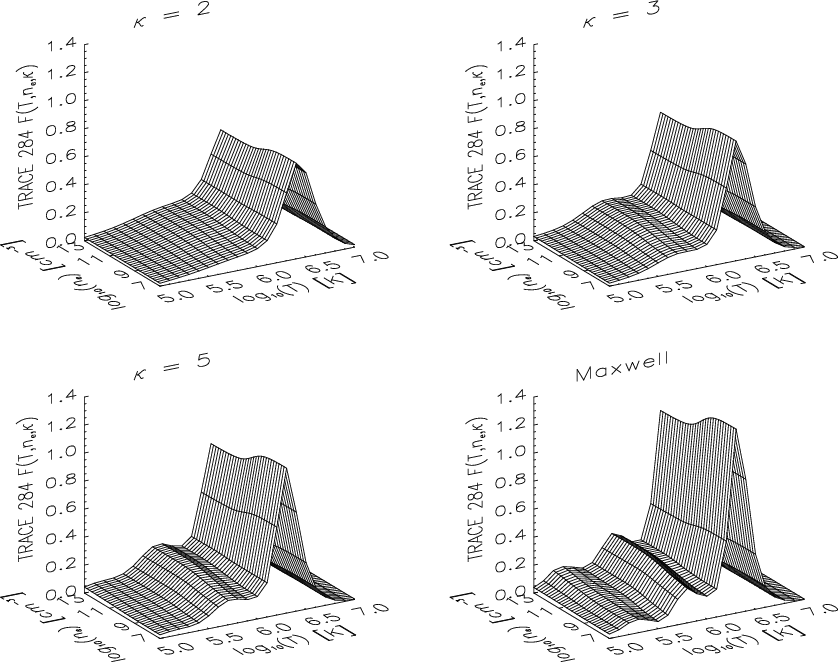 for the Maxwellian distribution. The He II emission is responsible for the appearance of the smallest peak in the TRACE 284 Å filter response to T (Fig. 2).