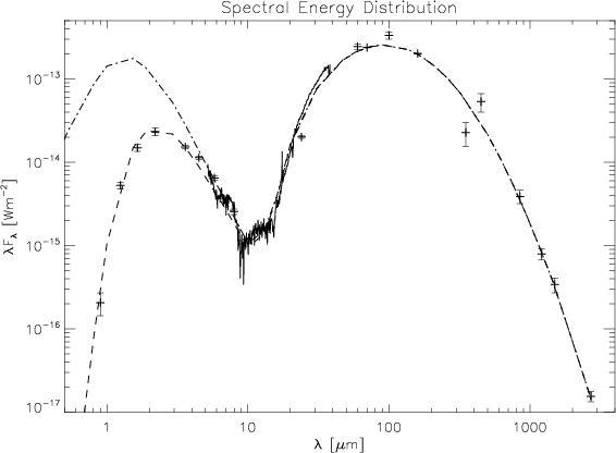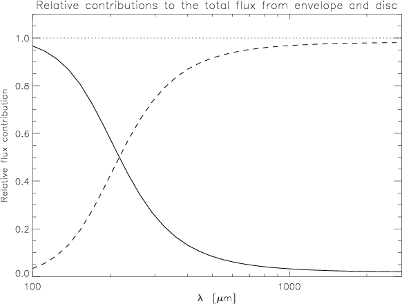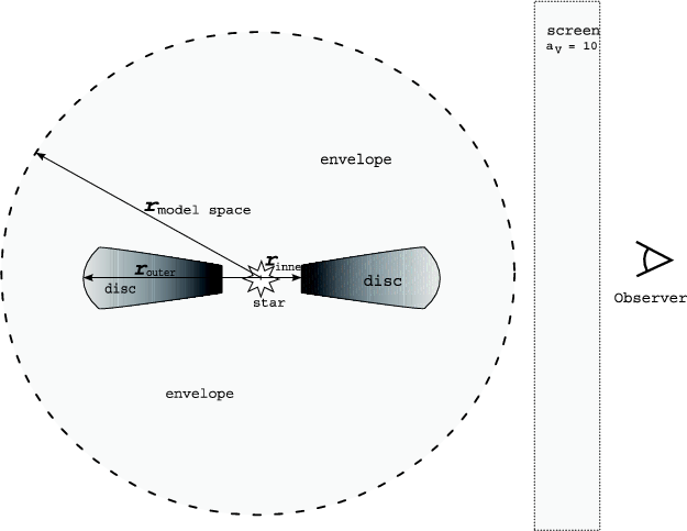 Degeneracy might also be an issue for the stellar parameters. Varying the luminosity and effective temperature of the embedded T Tauri star in general changes the total energy throughput in the radiative transfer and the location of the peak of the stellar spectrum in the wavelength space. Deviations from our assumed ``typical'' T Tauri star of course will affect the numbers of our best-fit model. For instance, the total mass critically depends on the flux in the millimetre regime and this flux on the total energy provided by the central star. Also, the screen introduced to mimic interstellar extinction is affected by the choice of surface temperature. However, no choice of stellar parameters is able to affect the main conclusions of our model. These are the presence of ISM grains in the disc and the disc inner hole.