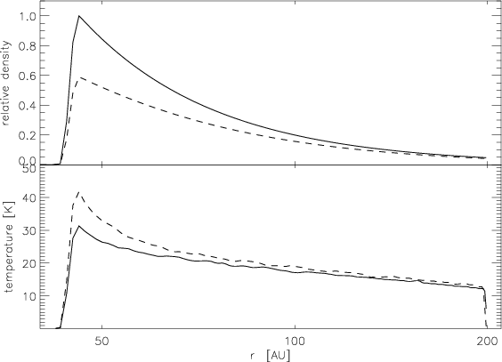 - This implies that we neglect line emission and absorption by the gas. We do not aim at modeling those throughout the entire disc since the dust is by far the dominant coolant of the disc. Hence, thermal equilibrium obtained in radiative transfer calculations based on dust only will provide a reliable description of the disc's thermal. structure.