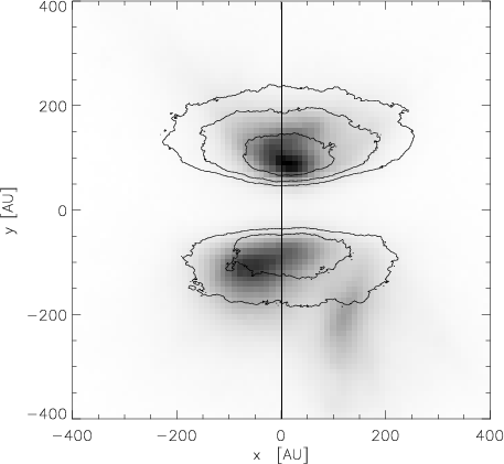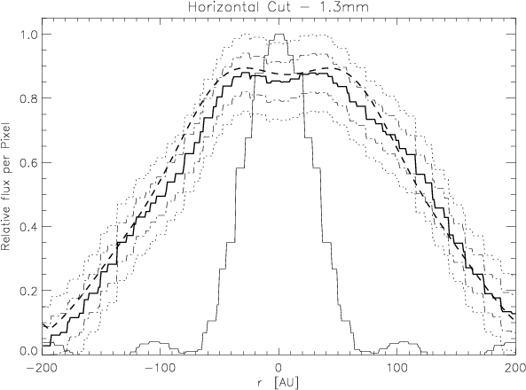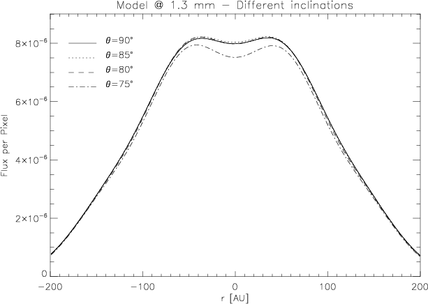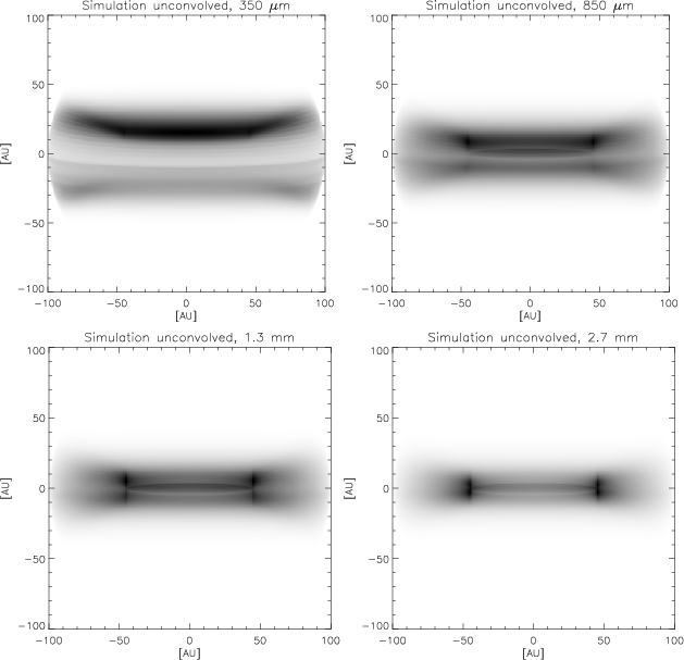 map we needed to include an inner hole with a radius of 45 AU. Future observations, especially in the sub-millimetre regime, are required to confirm our interpretation of a low optical depth along the line of site at
