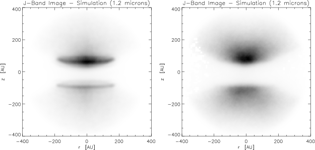 In order to compare our model with the available observations, we use the self-consistent radiative transfer code MC3D (Wolf 2003b; Wolf et al. 1999) in a parameter space study on the free parameters of the model. We aim at finding the best-fit model, which we define to be the model that reproduces certain predefined features among the observational data (such as width of the dark lane; see below for further details) best.