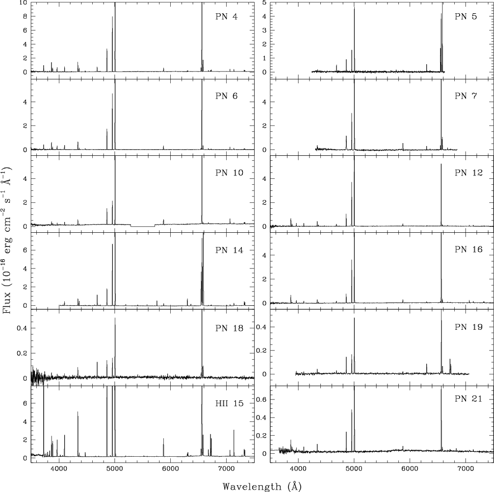 Our spectra of PNe and one H II region are shown in Fig. 1.