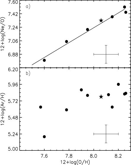 O and Ne original abundances in PNe can be perturbed by stellar nucleosynthesis in at least two ways. In more massive progenitors, O can be depleted through the ON-cycle (e.g., Peimbert 1985; Henry 1990; Costa et al. 2000). On the other hand, low metallicity PN progenitors can dredge up freshly synthesized O (and possibly also Ne, besides C) to their surfaces, in the third dredge-up episode (Marigo 2001; Herwig 2004; Leisy & Dennefeld 2006; Wang & Liu 2008), although this apparently happens significantly only at very low metallicity. For instance, in some very metal poor galaxies it has been found that oxygen abundances of PNe (and apparently also Ne) are higher than the average value of H II regions. Such is the case in the only PN known in Sextans A (Kniazev et al. 2005; Magrini et al. 2005), in the 8 PNe studied in NGC 3109 by Peña et al. (2007), in a large fraction of PNe in the SMC and in a small but significant fraction in the LMC (Leisy & Dennefeld 2006). Thus, neither O nor Ne can be considered safe for testing the original chemical composition of progenitor stars.