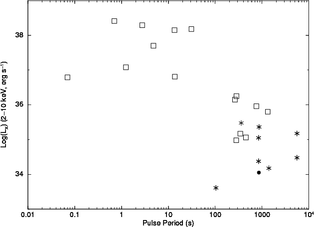 Figure 8: X-ray luminosity (in the 2-10 keV energy range) of the XBPs with a detected thermal excess as a function of the pulse period. The filled circle refers to the XMM-Newton observation of RX J1037.5-5647, asterisks refer to other detections of hot BB pulsars, open squares to all the other bright sources. |
