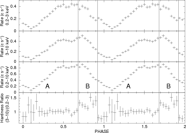 Figure 1: Background-subtracted light curves of RX J1037.5-5647 in the energy ranges 0.2-3, 3-10, and 0.2-10 keV, folded at the best-fit period P = 853.4 s. The vertical lines indicate the phase intervals used for the phase-resolved spectroscopy (see Sect. 5). |