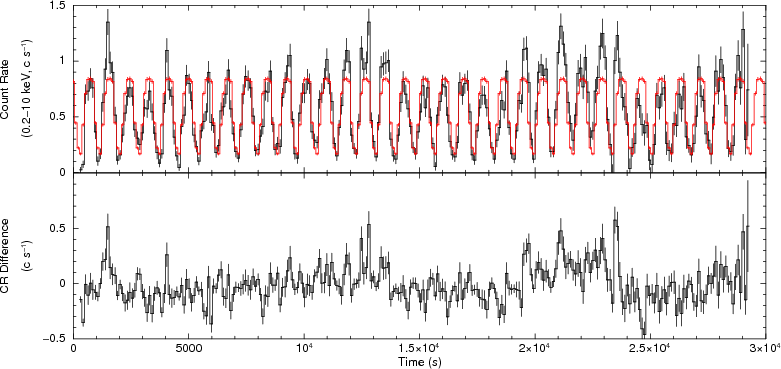 Figure 2: Top: observed (black) and average (red) light curve of RX J1037.5-5647 in the energy range 0.2-10 keV. Bottom: count-rate difference between the individual time bins of the observed and average light curve. |