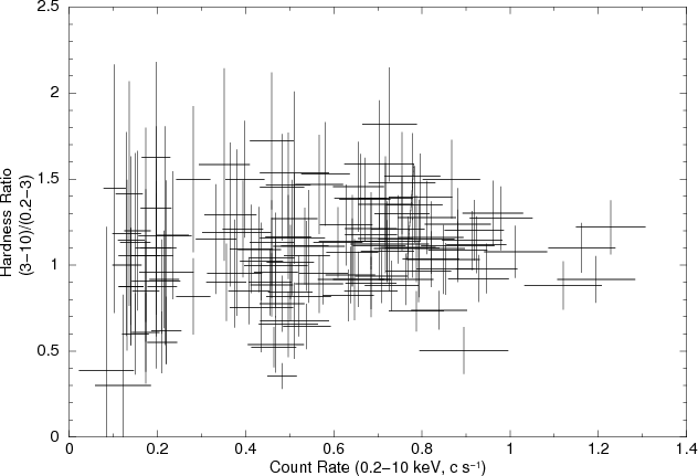 Figure 3: Hardness-ratio variation of RX J1037.5-5647 as a function of the 0.2-10 keV count rate, with a time bin of 213 s. |