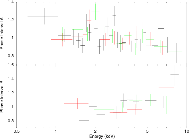 In the source folded light curve (Fig. 1), we observed that the source spectrum becomes slightly harder at the end of the pulse maximum. To study the source behavior in more detail, we analyzed the background subtracted spectra in two different phase intervals, i.e.
