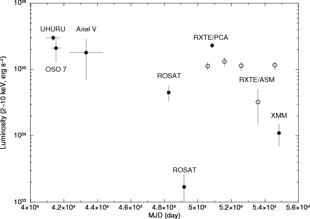 Figure 6: Luminosity history of RX J1037.5-5647 from 1971 to 2009. Reported luminosities are based on the unabsorbed flux in the 2-10 keV and on a source distance of 5 kpc (Motch et al. 1997). Open circles refer to the average luminosity (between 2 and 10 keV) estimated by RossiXTE ASM in five time intervals of 1000 days each. |