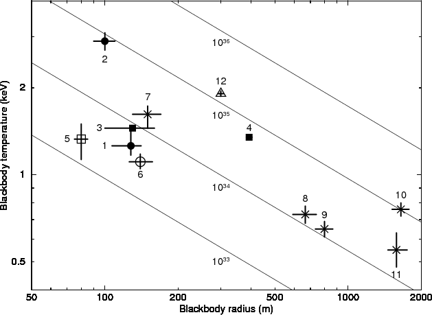 Figure 7: Best-fit values for radius and temperature of the BB component in the case of RX J1037.5-5647 (filled circles), 4U 0352+309 (filled squares), RX J0146.9+6121 (open circle), 3A 0535+262 (open square), SAX J2103.5+4545 (open triangle), and 4U 2206+54 (crosses). The continuous lines connect the blackbody parameters corresponding to four different levels of luminosity (in erg s-1). References: 1 - this work; 2 - Reig & Roche (1999); 3 - Coburn et al. (2001); 4 - La Palombara & Mereghetti (2007); 5 - Mukherjee & Paul (2005); 6 - La Palombara & Mereghetti (2006); 7 - Masetti et al. (2004); 8, 9, 10 - Torrejón et al. (2004); 11 - Reig et al. (2009); 12 - Inam et al. (2004). |