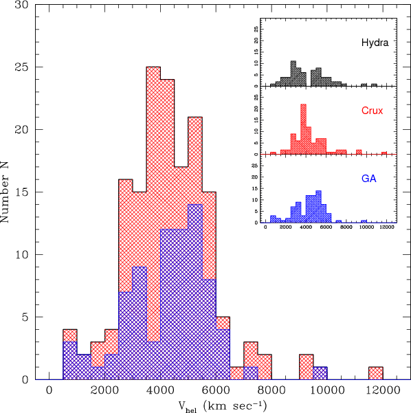 400 < v < 10 500 km s-1. A total of 162 galaxies were detected (plus 14 galaxies in the Vela region). The detection rate is slightly higher than for the Hydra/Antlia region (52% versus 45%) observed in the same way. This can be explained by the prominence of the GA overdensity in the survey regions, which leads to a relatively higher fraction of nearby galaxies. It is also evident from the quite narrow velocity distribution (largely confined to