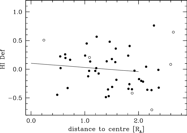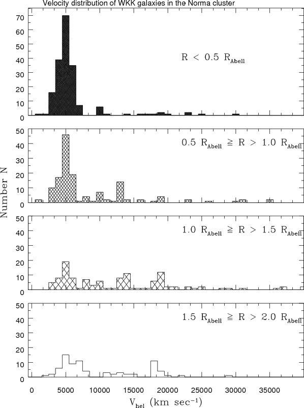In the following section, a short description of the observations is given (see Paper I for further details). Section 3 presents the H I data and line profiles of the detected galaxies. In Sect. 4, the non-detected galaxies are listed with their respective velocity search range. An analysis of the properties of the detected galaxies, the velocity distribution as well as the detection rate (Sect. 5) is followed by a detailed discussion of H I-deficiency in the Norma cluster (Sect. 6). We then present a description of the three-dimensional galaxy distribution in and around the investigated area (Sect. 7). A summary is given in Sect. 8. Throughout the paper we assume a Hubble constant of H0 = 70 km s-1 Mpc-1.