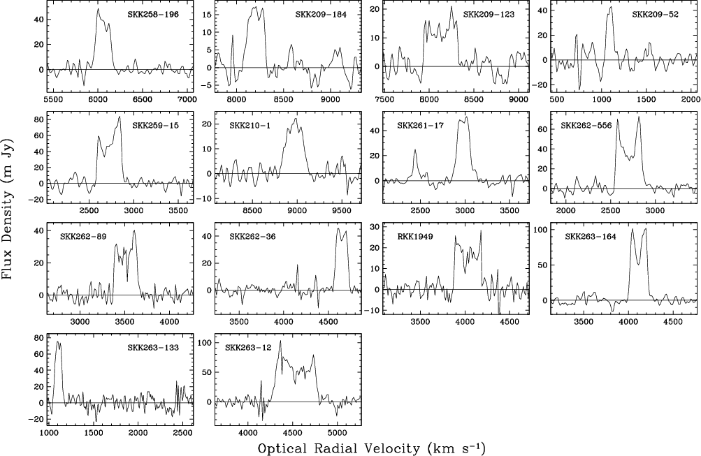 Figure B.1: H I profiles of the 14 H I detections in the Vela region. The vertical axis gives the flux density in mJy, the horizontal axis the velocity range (radio convention), generally centred on the radio velocity of the galaxy displaying a width of 1600 km s-1. All spectra are baseline-subtracted and generally Hanning-smoothed. The respective identifications are given within the panels. |