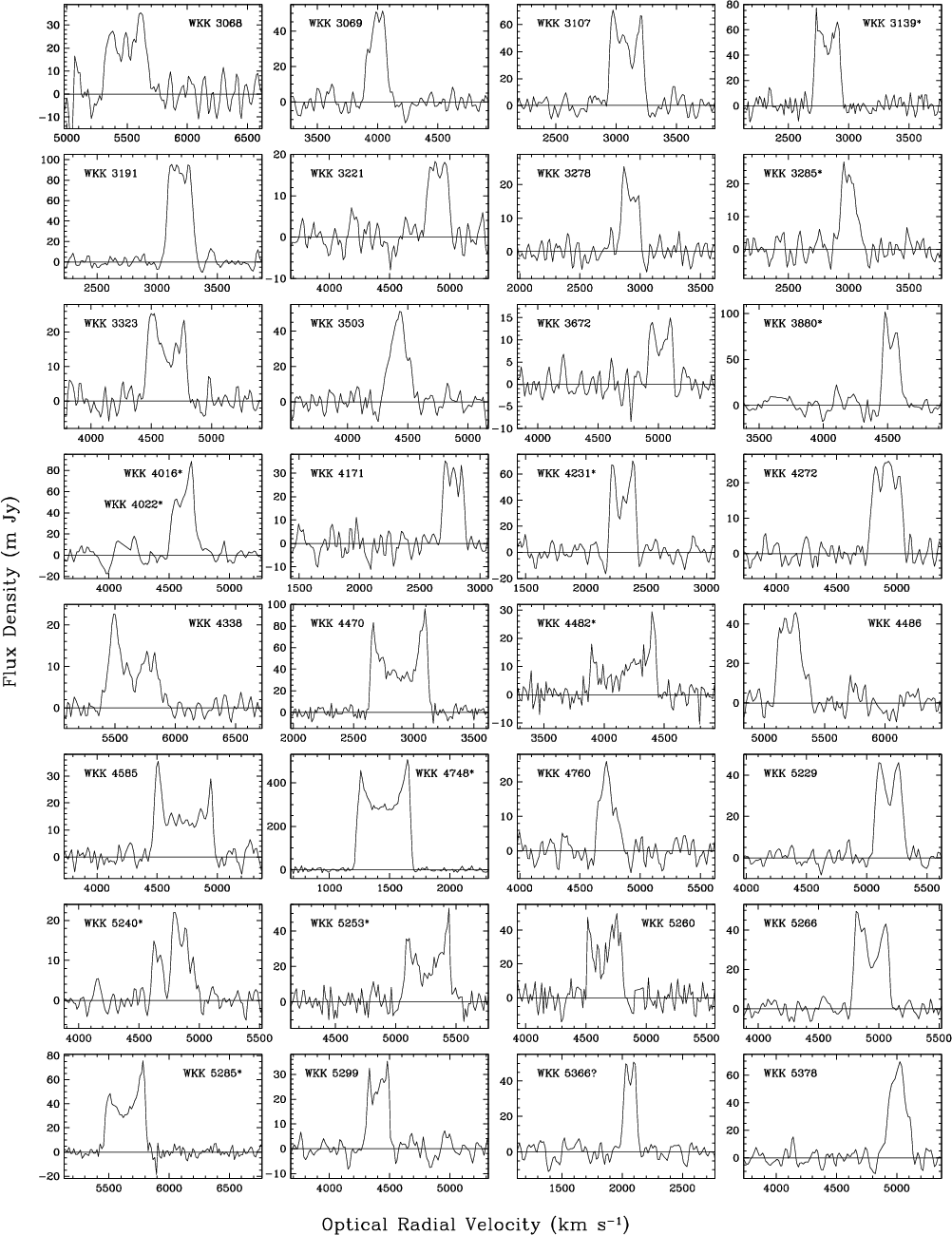 Figure 1: Baseline-subtracted H I profiles of the 162 detections in the Crux/GA region. The vertical axis gives the flux density in mJy, the horizontal axis the velocity range (optical convention), generally centred on the velocity of the galaxy and displaying a width of 1600 km s-1. All spectra are baseline-subtracted and generally Hanning-smoothed. The identifications are given within the panels. Question marks indicate uncertain identifications, stars denote a detection not at the centre of the beam. |