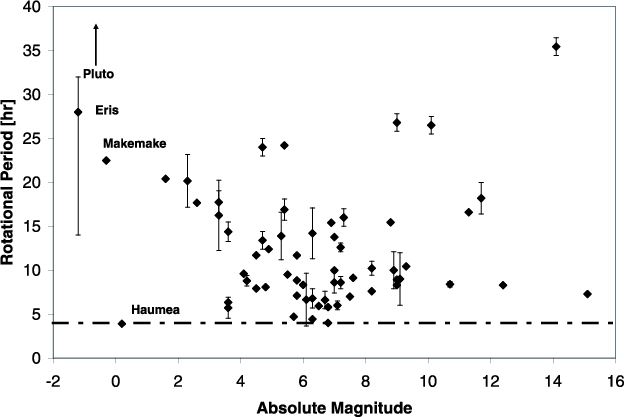 Finally, another interesting plot is the rotational period versus absolute magnitude (an indicator of the size), where we can see (Fig. 5) that a rotation barrier could exist close to 4 h. All the points have an error bar that indicates the period determination error when the result is unique and a larger error when the period has several values in the literature. A typical example of multiple determinations in the literature is Eris, for which the period has been determined to be either 13.7 h (Duffard et al. 2008) or 25.92 h (Roe et al. 2008).