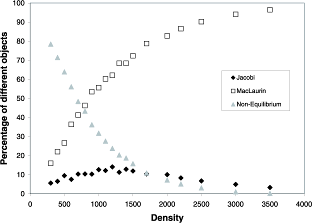 Table 3: Some results using the simple model. Listed are the minimum and maximum rotational period that a Jacobi ellipsoid can rotate. The percentage of different kinds of objects (Jacobi/MacLaurin/non-equilibrium) are presented.