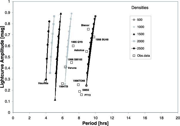 With the rotational period sample, it is possible to derive some constraints on the density of the objects. Several authors have presented different estimations on TNO densities. Pravec & Harris (2000) derived a simple expression that approximates the critical (minimum) period for a rotating body as a function of density and light-curve amplitude. This relation assumes a fluid body. Sheppard et al. (2008) used the periods and shapes (derived from light curves) to identify an apparent trend of larger (brighter) objects being denser. Finally, Tancredi & Favre (2008) analyzed TNO densities and internal structures to determine whether TNOs could be dwarf planets.We note that objects with radii r > 200 km have presumably never been disrupted by impacts (Davis & Farinella 1997), but have probably been in some way fractured. If we assume that TNOs have relaxed to equilibrium shapes, then their rotation states can be used to place limits on their densities. The centripetal acceleration produced by self-gravity (bulk density) must be sufficient to hold the material together against the inertial acceleration due to rotation. Although TNOs consist of solid material, their presumably fragmentary structure validates the fluid approximation as a limiting case.