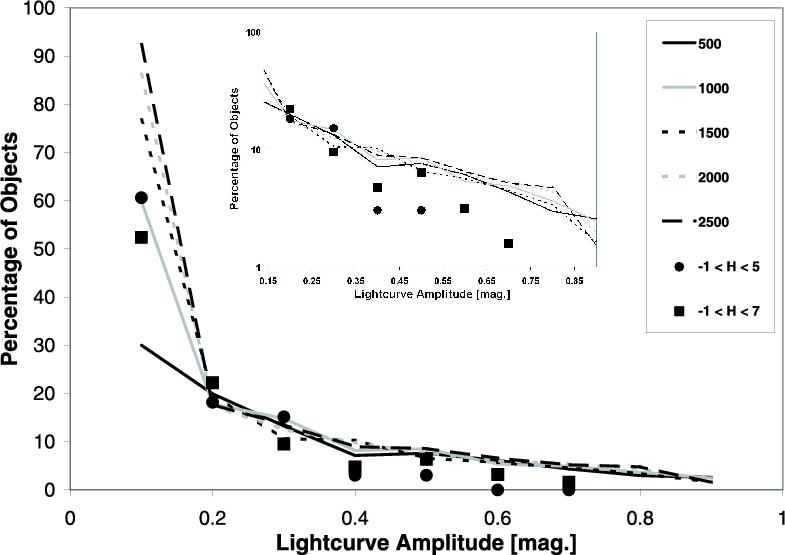 Taking into account all the light curve amplitude and rotational period data presented, it can be seen that ``flat curves'' are dominant. As mentioned before, this could be because we are observing large presumably round objects. In the near future, more light curves should be obtained of smaller objects and the question may then arise of whether this tendency remains and how many non-flat curves are observed. To estimate how many non-flat curves are expected in an observed population, we developed a simple model.