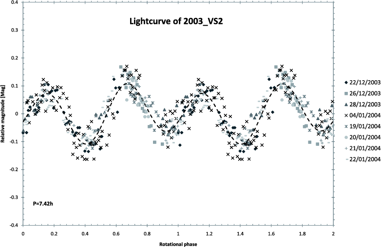 An example of the kind of light curve studied here is presented in Fig. 1. In this example, data of the object 2003 VS2 over several nights was observed and the composite light curve was compiled to determine the rotational period and amplitude. Unfortunately, it is not always possible to obtain a well determined period and/or amplitude. Authors sometimes place a constraint on the values of periods and/or amplitudes, and we note that the literature is populated by these kinds of results. In Table 1, we list all objects with published rotational period and/or light curve amplitude or constraints in one of these values. In any case, for all the considerations in the paper only the objects with a well determined period/amplitude pair are taken into account. That is the case for 72 objects. In case of multiple determinations of the period and/or amplitude, the criteria selected the preferred value by the author who published that value. If no preferred value is mentioned, the mean of the listed values was used.