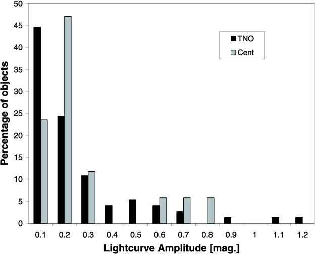 In Fig. 2, we show the percentage of objects that have an amplitude value within a specific peak-to-peak amplitude (in 0.1 mag bin) of the well determined 91 amplitudes (74 for TNOs, and 17 for Centaurs) from Table 1. We note that some papers only report the amplitude, or some restriction in the amplitude, but no period. That is the reason why the number of amplitude determinations differ from the rotational period determinations.