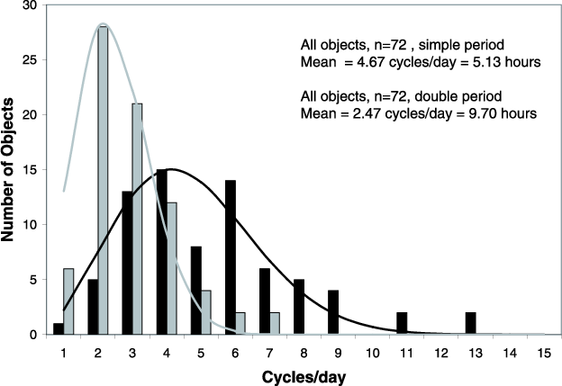 From KBO light curves alone it is difficult or even impossible to determine whether the variability is caused by either albedo variations or an elongated shape. Therefore, the rotation periods derived from the photometric periods often have an uncertainty of a factor 2. A double-peaked periodic light curve is expected to be seen in a non-spherical body, since the projected cross-section should have two minima (short axis) and two maxima (long axis) during one complete rotation of the KBO. Light curves caused by surface inhomogeneities are single peaked. Figure 3 (in black) shows the histogram of rotational frequencies (single-peak rotational period) for all the objects found in the literature. This histogram was compiled by assuming that all objects have single-peaked light curves, which is obviously not true and is an extreme case. For the well known cases in which the light curves are certainly double-peaked, we used the rotation period corresponding to half the true rotation period. Therefore, the resulting distribution of rotation periods has a short mean value, which is a crude lower limit to the mean rotation period. A Maxwellian curve was fitted and overplotted in the histogram for a mean period of 5.13 h.