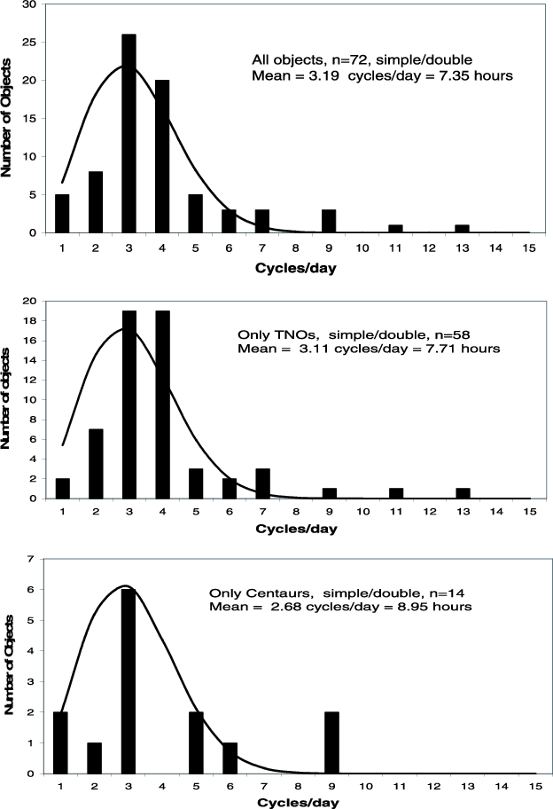 Figure 4: Histogram in cycles/day for the whole sample ( top panel), the TNOs ( center panel) and Centaurs ( lower panel). From maxwellian fits to the rotational frequencies distribution the mean rotation rates are 7.35 h for the entire sample, 7.71 h for the TNOs alone and 8.95 h for the Centaurs. We chose to use the single peak period for the objects whose amplitude is <=0.15 mag and double peak period for the objects whose amplitude is >0.15 mag. |