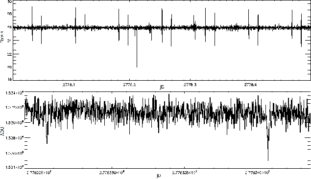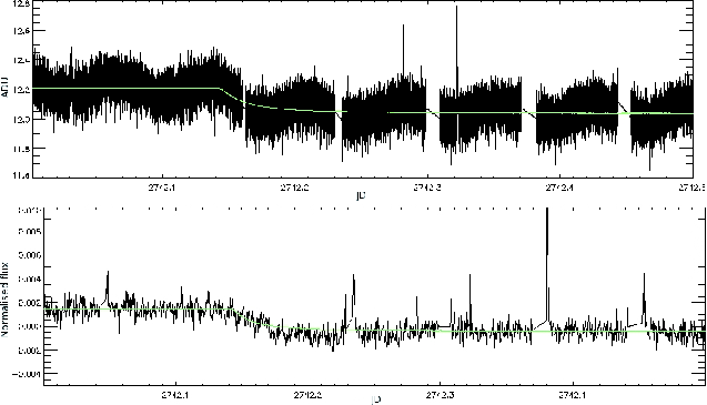 This algorithm has not been implemented yet on the PF light curves, because the PSF computation is more difficult than for the AS objects, in part because the integration time is longer but also because the objects are faint and their images undersampled. But some tests have been made of the proposed method and examples of the results are shown in Fig. 27 for two stars, a binary star and a constant one. On this second star we can see a small correction residual but the perturbation is reduced by more than a factor 40 (Fialho, private comm.).