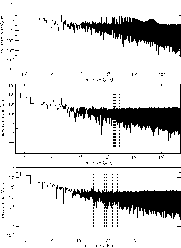 The spectrum is computed using 145 days of run LRc01. The data are corrected as described in Sect. 6 and the results shown in Fig. 28. For comparison with the specification of 0.6 ppm in 5 days (for a V = 5.7 star) the result is normalised to correspond to a 5-day run.