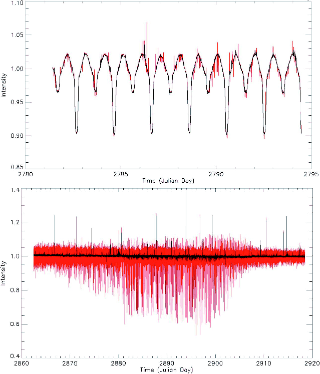 Red light curve on the PF channel for two stars. Upper panel: a binary star sampled at 512 s (
