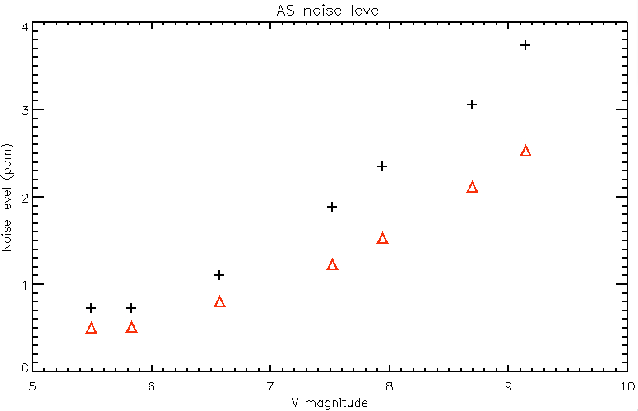 The small differences between the photon noise and the real one, around V = 5.8, come from the jitter correction residual. A recent paper on the star HD 49933 (Appourchaux et al. 2008) reports the detection of several tens of solar-like p-mode oscillations with a S/N down to 1.5 and amplitude less than