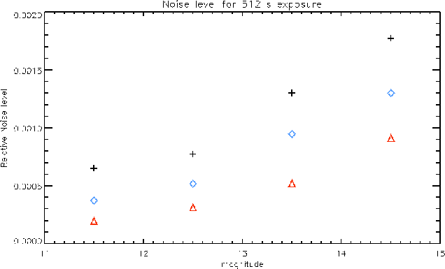 Figure 29: Crosses: measured rms on white light curve. Blue diamond: the same but measured on a time interval without eclipses. Red triangles: white noise level (photons noise plus readout noise plus background photon noise). |