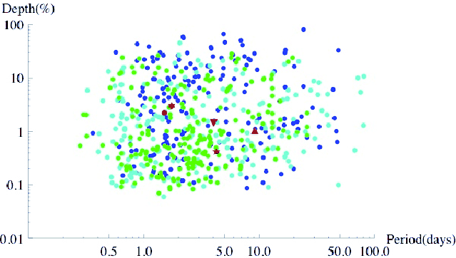 Figure 30: Transits detected in CoRoT data during the three first runs (dark blue, light blue, and green points). Confirmed planets are red points. |