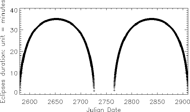 The eclipse durations vary along a run. The eclipses are longer at the beginning or at the end of a run (just after or before the equinoxes). Near the solstices there are no eclipses for more than a month (see Fig. 2). The longest eclipse duration is 34.72 mn. All other effects are explained in the following.