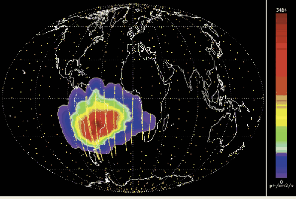 - South atlantic anomaly (SAA). The magnetic field is not a perfect dipole, and the radiation belts are distorted above South America. This is because the centre of Earth's magnetic field offset by 450 km from the geographic centre. Trapped particles are essentially protons with energies in the interval 10 keV to 300 MeV. The electron belts around the pole do not perturb the detectors thanks to a 10 mm aluminium shielding.