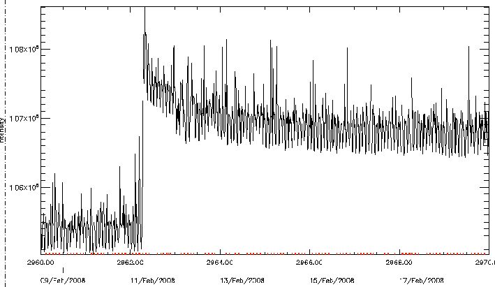 Figure 5: Example of a background raw-data light curve (LC) perturbed by a new hot pixel appearing during the crossing of the SAA. In this example the hot pixel intensity decreases exponentially on a 1-day time scale and reaches a stable but higher mean value. Orbital straylight oscillations are also clearly seen. |