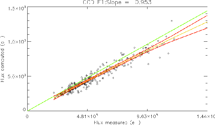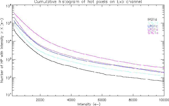 At the beginning of each run, the bright pixels are detected on PF CCDs images as a function of their intensity. The results are shown in Fig. 6 and in Table 1. The evolution of the number of hot pixels appears to be linear in time so that we can extrapolate this number to the satellite's end of life.