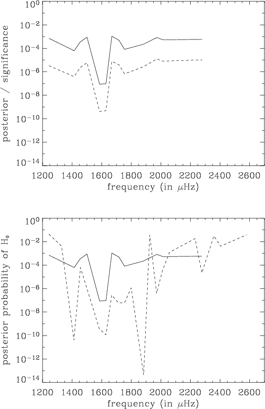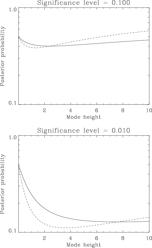 ( Top) Comparison of the posterior probability (solid line) with the significance level (dashed line) as a function of frequency for a spectrum smoothed over 5 bins ( |