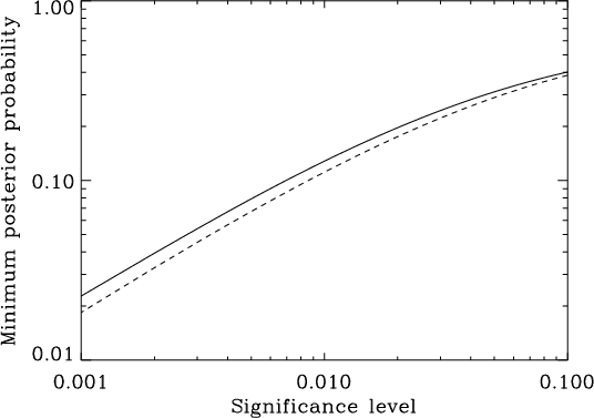 Figure 3: Lower bound to the posterior probability as function of the significance level for the known mode height (dashed line) and for the uniform prior (solid line). |