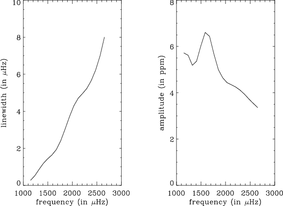 Figure 4: ( Left) Theoretical mode linewidth of HD 49 933 as a function of frequency. ( Right) Theoretical mode amplitude of HD 49 933 as a function of frequency. |