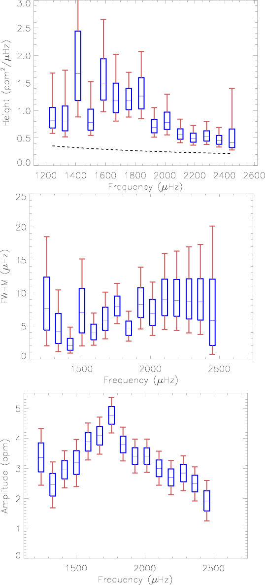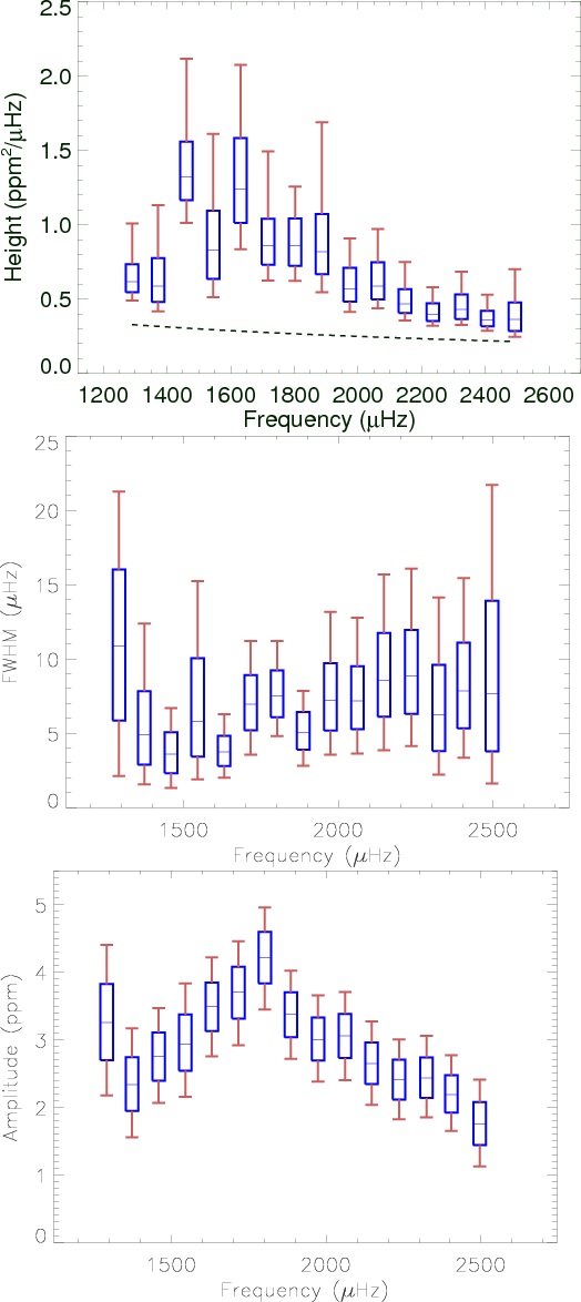 after removing the spacecraft orbital peaks) with 3 Lorentzian shaped components and a white noise (Eq. (3)) plus a Gaussian profile (characterized by its height A0, its central frequency