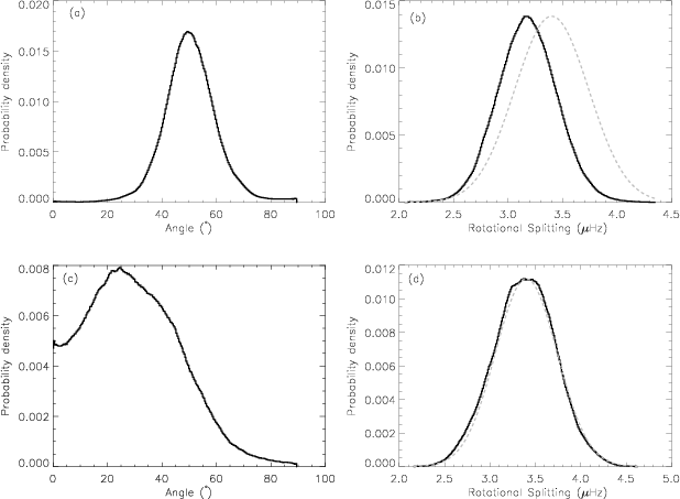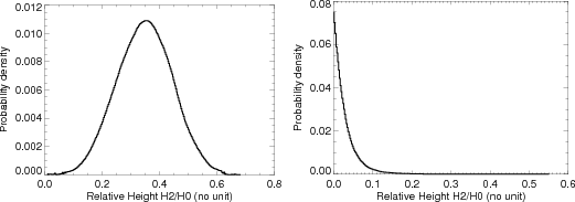 The relative heights H(n,l,m) of the split components of nonradial modes depend on the angle between the line of sight of the observer and the rotation axis of the star (see for ex. Gizon & Solanki 2003). Knowing that, we can define the heights of these components as a function of the angle. Depending on the available information, an angle prior can be set or not; here, in the case of the analysis of the simulated spectra (Sect. 4) or the real data (Sect. 5), a uniform prior over the range 0