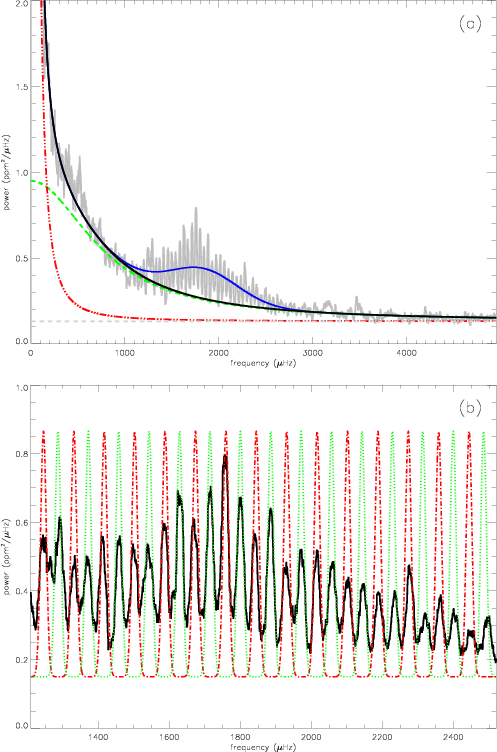 - we fit the power spectrum over a large frequency range (in the case of HD 49933, 0-5000