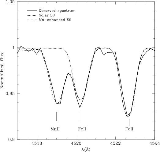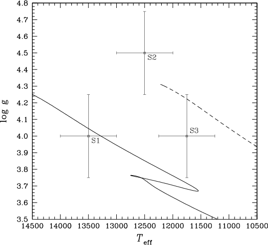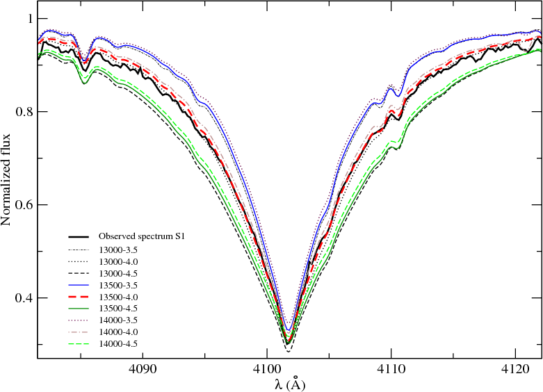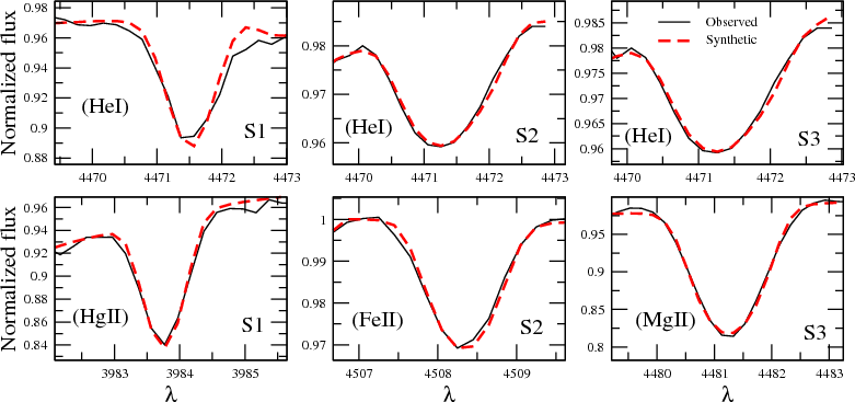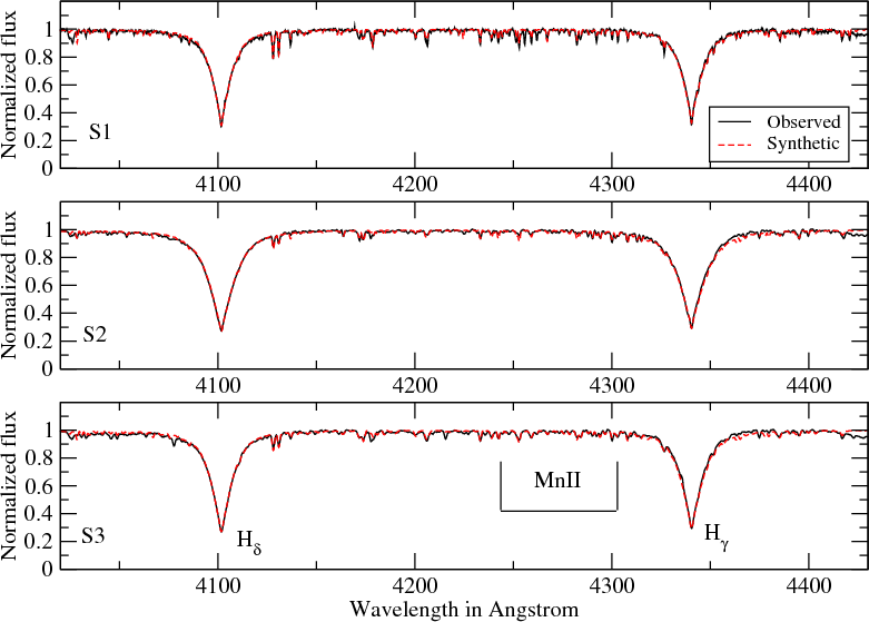 About 240 stars were observed in this run, and about 60 of them were classified in Exo-Dat as B0-A0 (IV-V) stars. To find HgMn candidates among these 60 stars, we searched for the characteristic pattern formed by two MnII lines (420.53 nm and 460.637 nm). This pattern is clearly visible in the spectra of HD 175640 (a high S/N UVES spectrum of this star was kindly communicated by Hubrig, see Castelli & Hubrig 2004), and remains clearly recognizable after degrading the S/N to 100. After a close examination of the spectra of these 60 stars, one star (S1) was found to show MnII line pattern very similar to HD 175640 (degraded spectrum), and two other stars (S2 and S3) were found with the same pattern, but less clearly. The characteristics of these three stars are shown in Table 1: their number in the USNO-A2 catalog, the visual magnitude from Exo-Dat, and the fundamental parameters discussed in Sect. 3.3. A rough estimate of various line strengths for abundances in HgMn stars was made using the COSSAM code (Stift 2000), and we checked the consistency of our selection of HgMn candidates by considering the spectra at other wavelengths. These three stars were then proposed to be included in the target allocated to the APs (Weiss 2006).