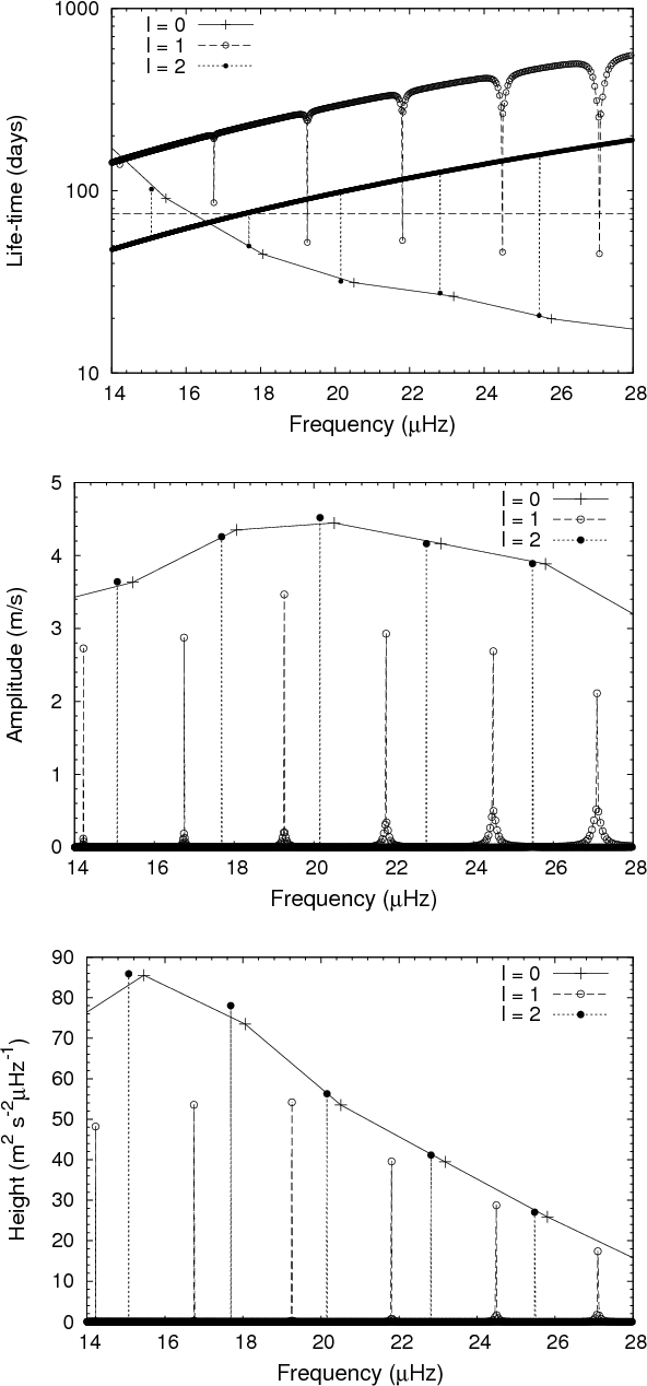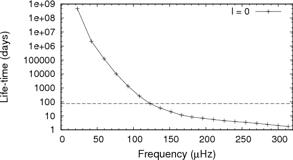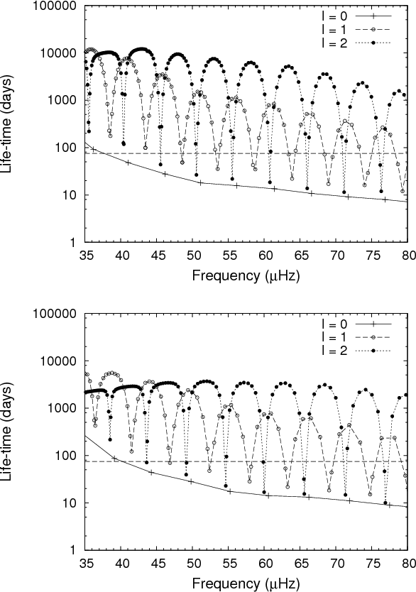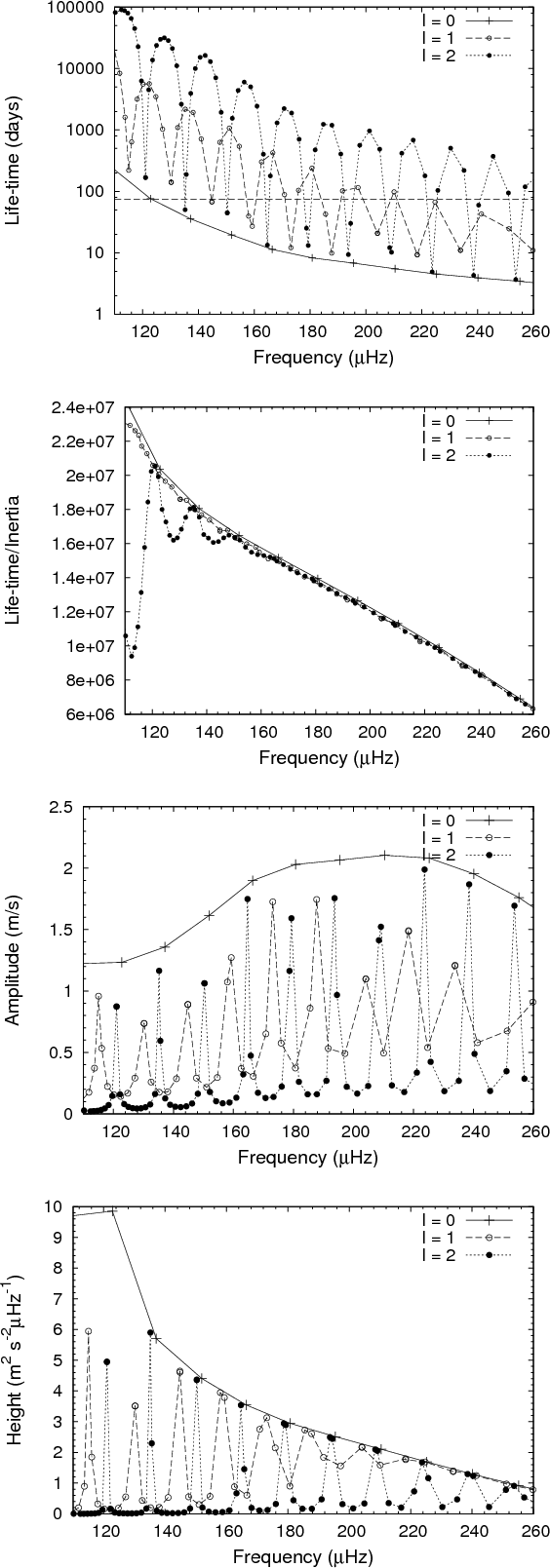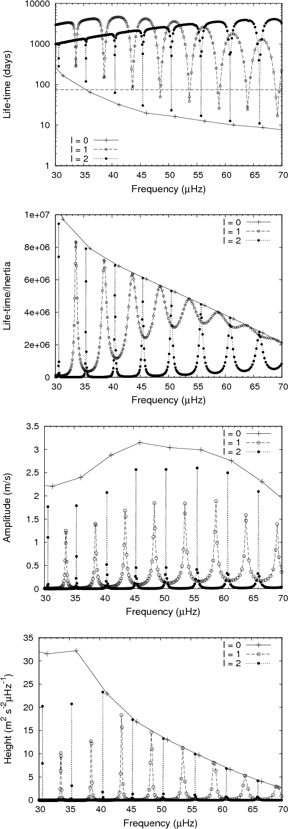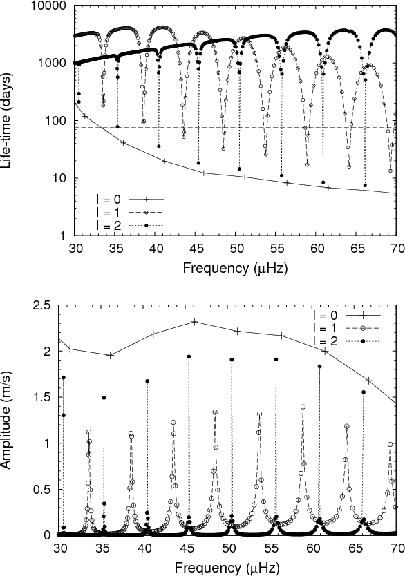 amplitudes than radial modes. Houdek & Gough (2002) carried out theoretical computations of the amplitudes and lifetimes of radial modes in the star Hydrae. They found lifetimes of