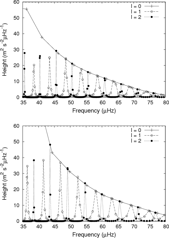 We also introduce the maximum height of the mode profile in the PS, which is an observable and will permit us to draw conclusions about the mode detectability (see Sect. 4 for details). To this end, one has to distinguish between two cases, namely resolved and unresolved modes. The resolved modes present a Lorentzian profile in the PS and their heights are given by (see e.g. Chaplin et al. 2005; Belkacem et al. 2006):