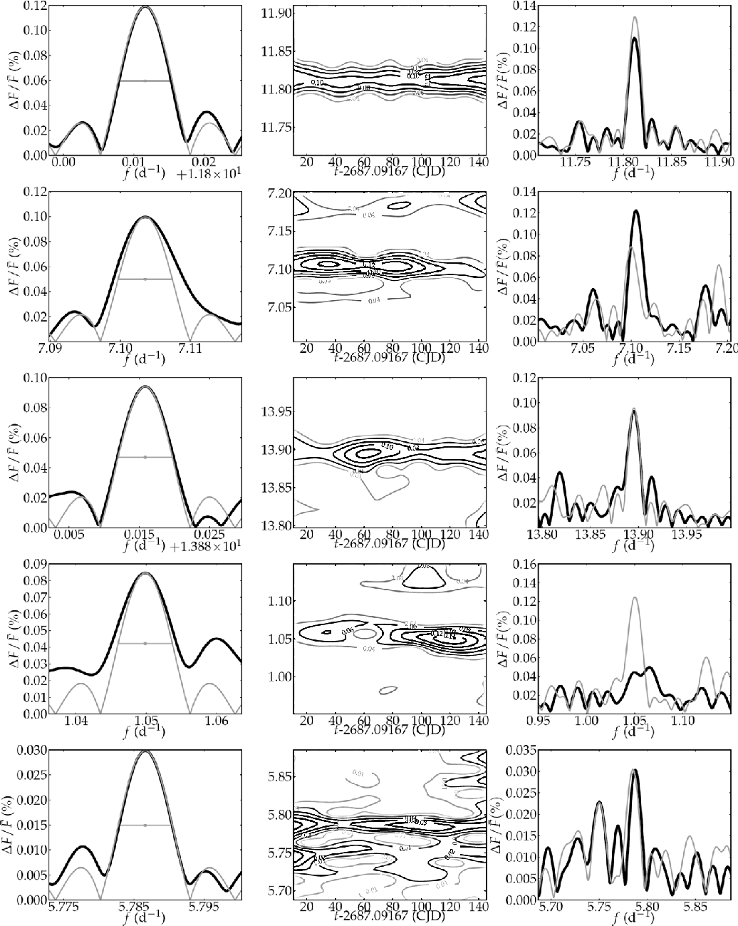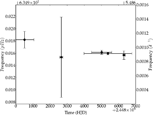 These facts suggest that the frequency of the dominant mode is not the same in these two data sets, but has instead decreased. From the datasets in Table 5, it is impossible to determine whether the frequency change is gradual or sudden, so we refrain from any physical interpretation, although it would be naturally explained as a frequency decrease due to the approaching of the star to the end of the core-hydrogen burning, as suggested by the low