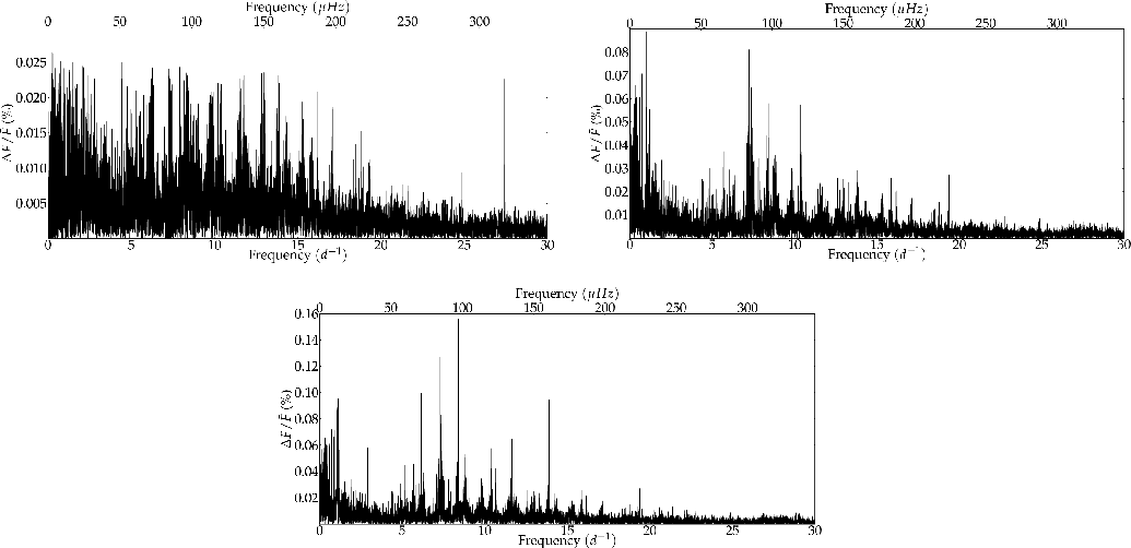 We estimated the large separations for the three residual power spectra shown in Fig. 12, assuming them to be caused by stochastically excited oscillations (p-modes), by using échelle diagrams with extracted frequencies and autocorrelations (Christensen-Dalsgaard 1988). We thus find, in the frequency range from 50 Hz to 300