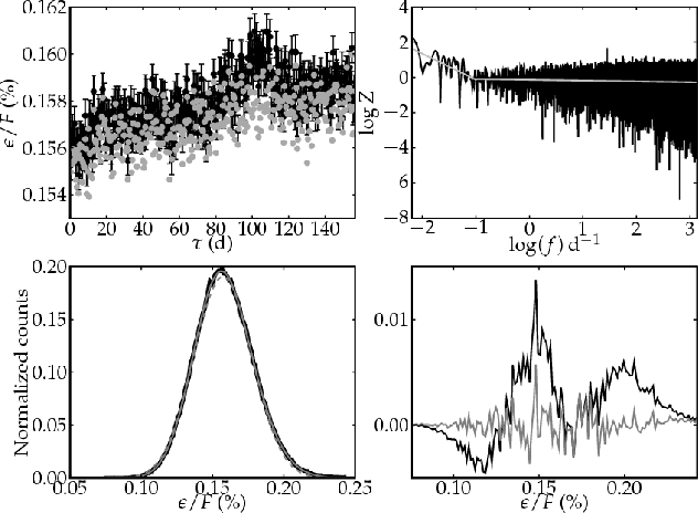 In conclusion, although the deviation from uncorrelated homoscedastic white Gaussian noise is significant for the CoRoT data, it is not dramatic: we are dealing with a slightly right-skewed, leptokurtic distribution. The above simulations suggest that a significant influence on parameter and error estimation is only noticeable for high departures of normality. Moreover, as becomes clear in the following sections, the noise level is inherently low compared to the analysed signals, and we are conservative in our significance criteria. In the following, we adopt a p value of p=0.001 in hypothesis testing, so that an order-of-magnitude estimate of p is important, rather than a precise value. If at all, only the correlation effects are worth taking into account for our analysis, which is done with the method outlined in Schwarzenberg-Czerny (2003).