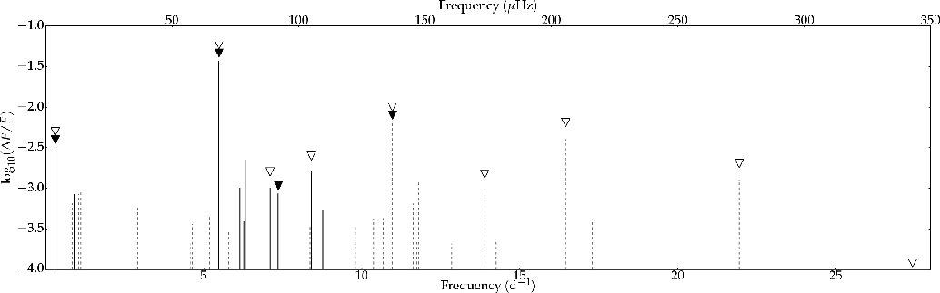 combinations (among which some harmonics) covering the frequency range [0.3,22] d-1. This model selection was based on statistical criteria, without considering physical arguments a priori. Nine of the independent frequencies of this model are in the range expected for